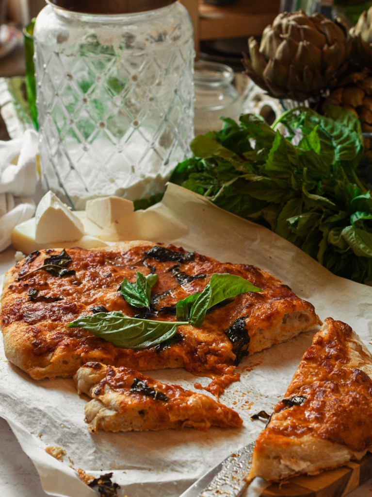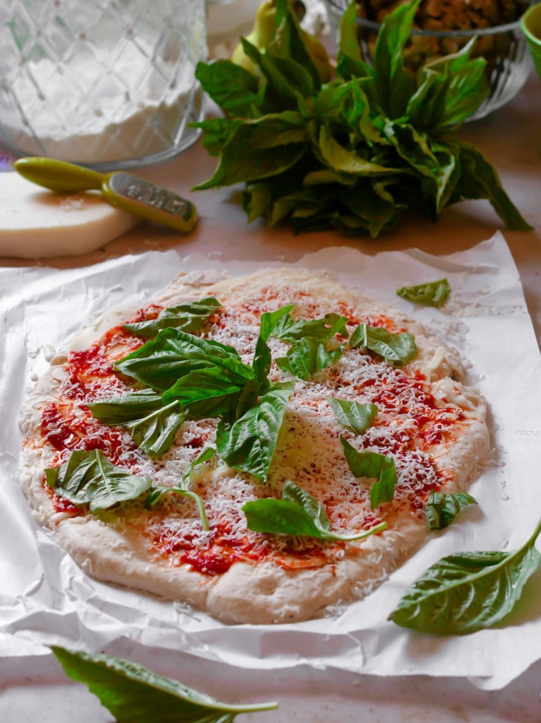 I don’t follow many “musts” in the kitchen but this one is important, use a wide shallow baking pan or shallow baking sheet. this will keep your dough from steaming and give you a nice even crust and bake on your pizza. Ideally invest in a set of aluminum baking pans, my two favorites have been a pair of 18×26 aluminum Nordic Ware sheet pans and a nonstick cake pan with lid from Faberware, both have been working hard in my kitchen for the past 15 years. They have become a but more pricey over the years, especially with the current aluminum shortage but they are going to outperform the flimsy single use foil pans as well as cost less in the long run. Keep and eye out for Amazon deals, promotions/holiday sales on the Nordicware webpage, group your Kohl’s cash and discount, etc. You’ll find a way !
