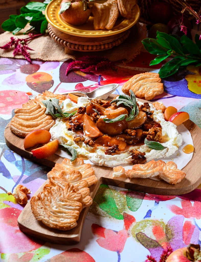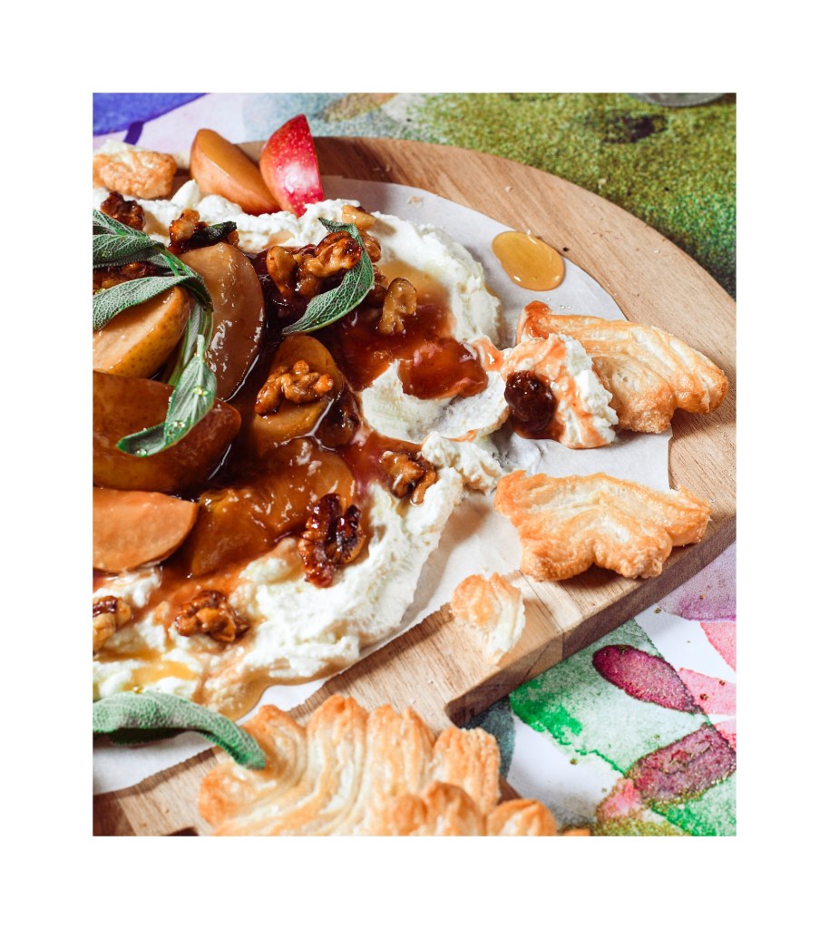Okay, why is this the best brunch, not quite butter board? It has all the sexy eye appeal of a butter board but with farmer’s cheese. Replacing regular everyday jam is a mixture of roasted sweet seasonal pears, jammy plums, crispy salty walnuts and crackly bits of fragrant sage to make it everything you want to spread on a bread or your carb of choice.