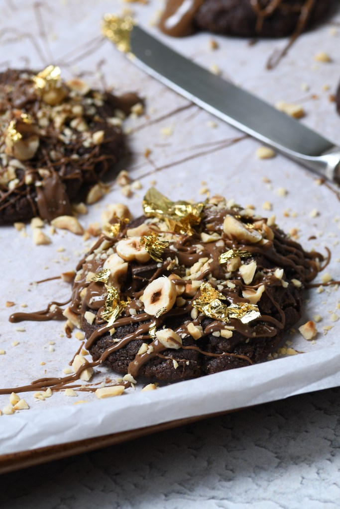 Do you need it to make these cookies? Nope. You can use any other decoration or omit it entirely. The flavor comes from the mixture of chocolate and the toasted hazelnut topping. The gold leaf is extra and a reason to play with gold leaf if that is something you’ve wanted to try!