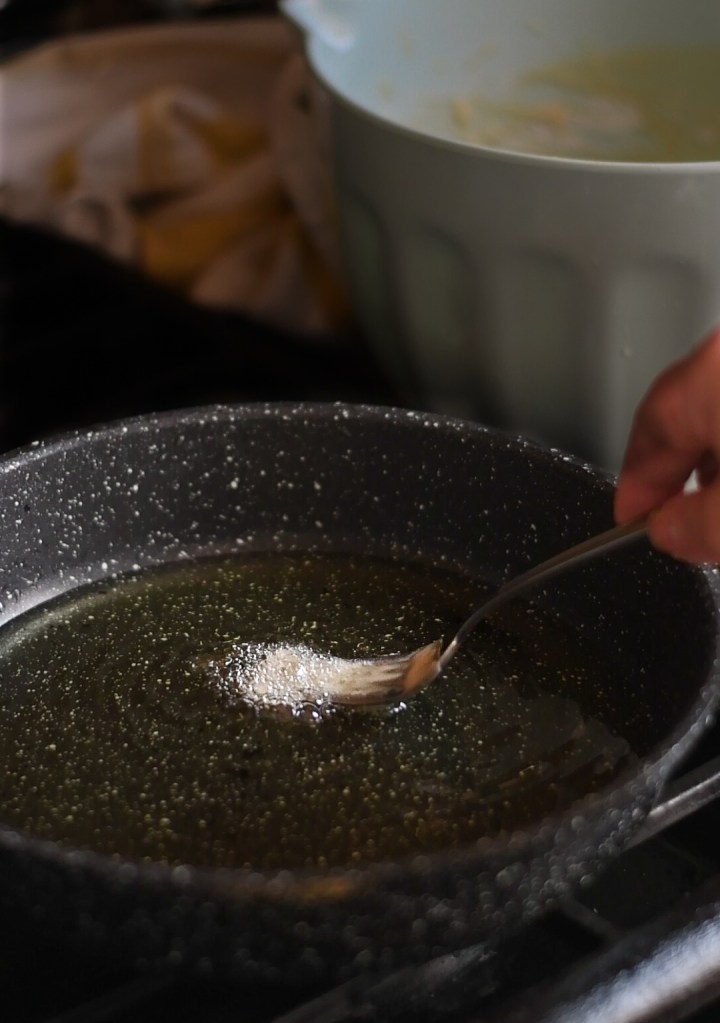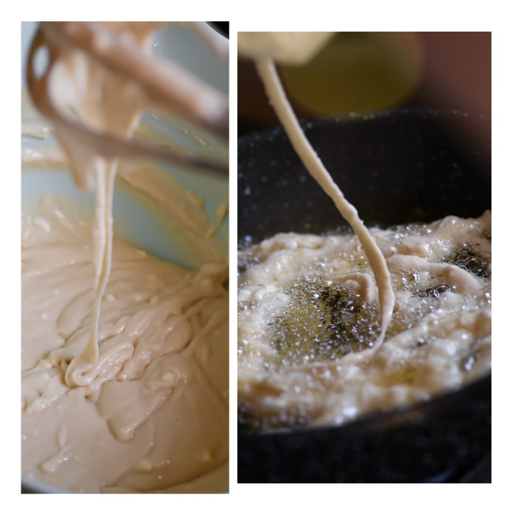 To this mixture add half of the boiling water and stir to combine. Batter should resemble something between a cake and pancake batter. Too thick and it won’t funnel into the oil, too thin and it will dissolve during frying.