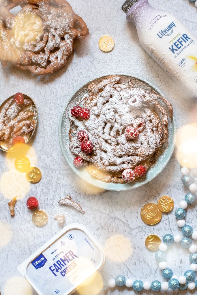 Can you leave it out? Unfortunately, not. It gives this funnel cake that fluffy chew you expect in a doughnut or funnel cake. The farmer cheese adds a rounded milky tanginess which is nice against the sweet powdered sugar.