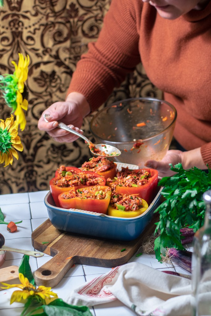 Fill each pepper halfway first and then continue filling spoon by spoon until each is filled shy of full. The filling will expand while cooking, and a little space keeps the peppers from bursting open.