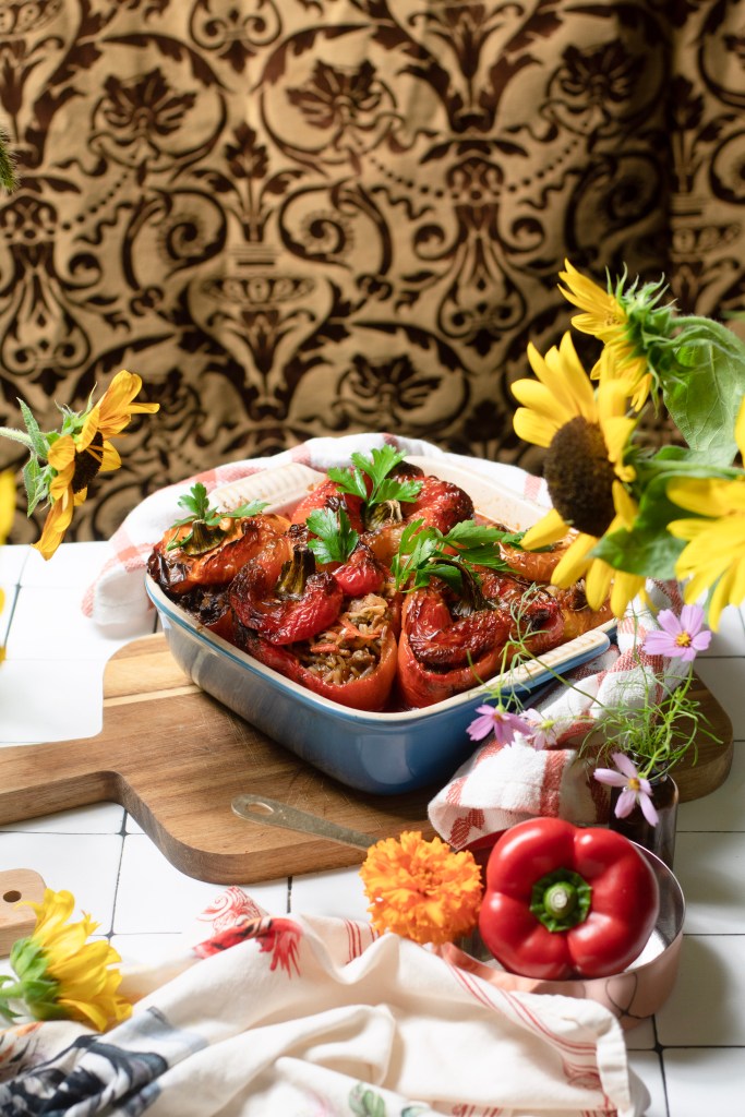 No Soggy or over cooked rice, tender peppers and a flavorful nostalgic filling make these the best stuffed peppers, that we have ever enjoyed. They cook up and smell like grandmas kitchen, your favorite diner or just a really good loving meal at home. They can be made on the stove top, in the oven or airfryer. Very Versatile, delicious and easily made fully vegan and gluten free. I share options in the recipe below.