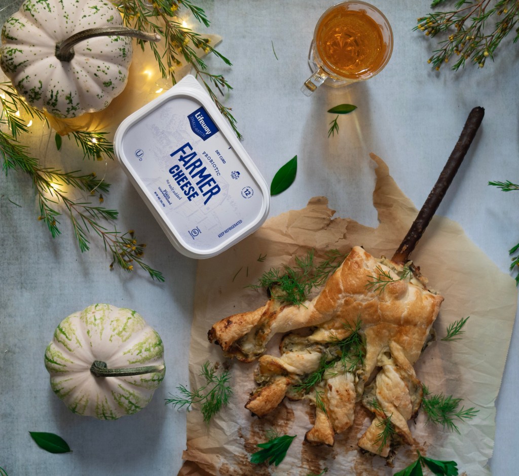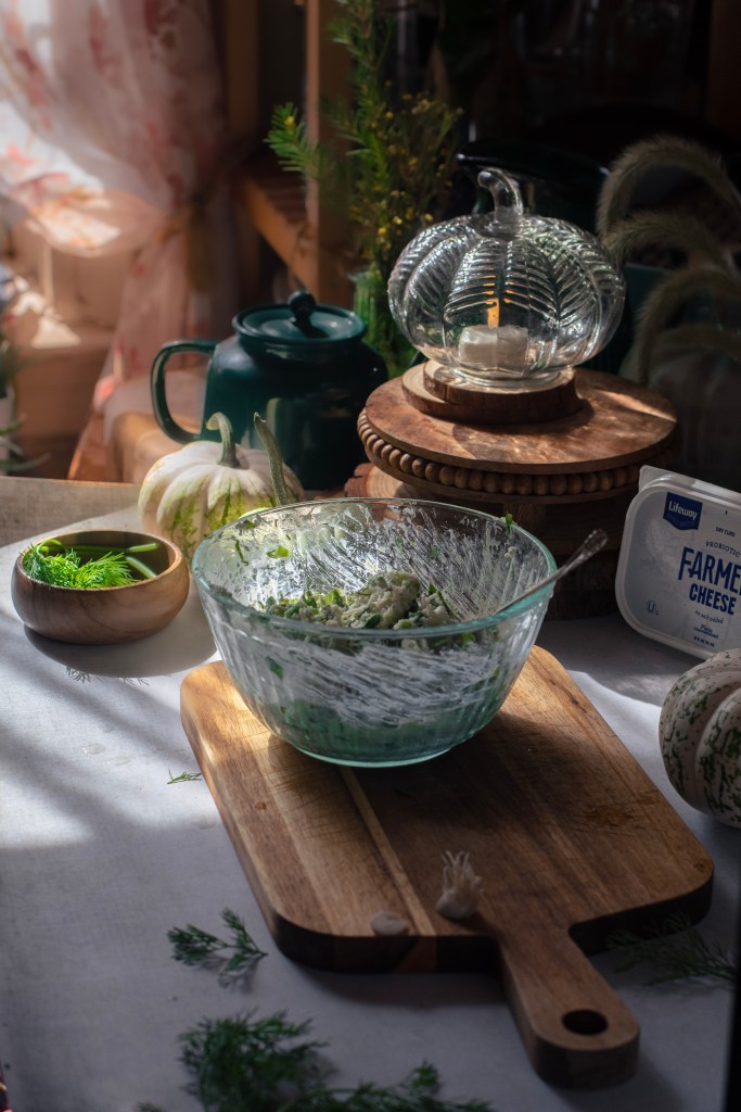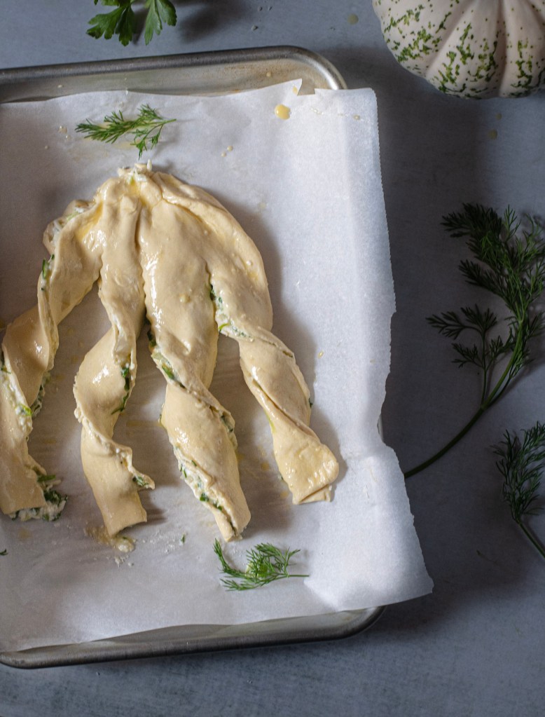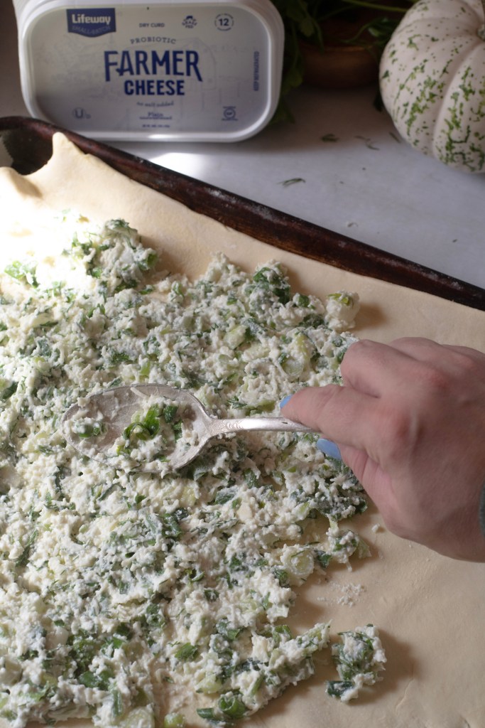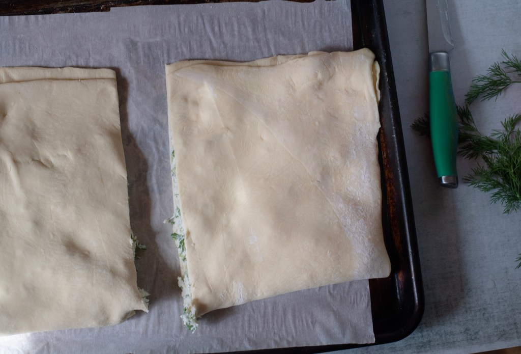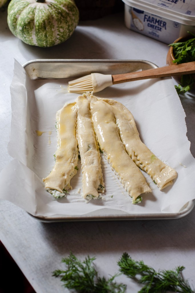 Puff pastry stuffed with a savory filling of farmer cheese sweet bite of scallions and a dill herb mixture.