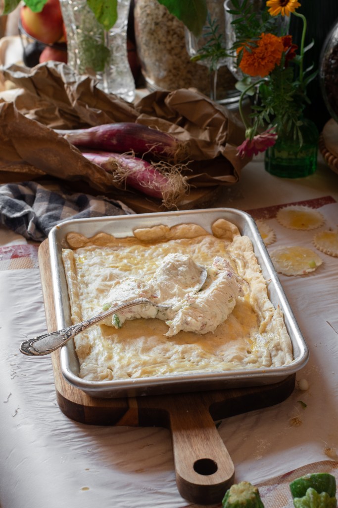 - Fit rolled pastry sheet to a half sheet pan, poke with fork across width of base and brush lightly with beaten egg. there should be left over egg to add into cheese mixture Set to bake at 425 for 5 minutes.
