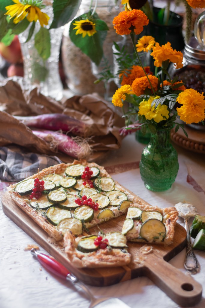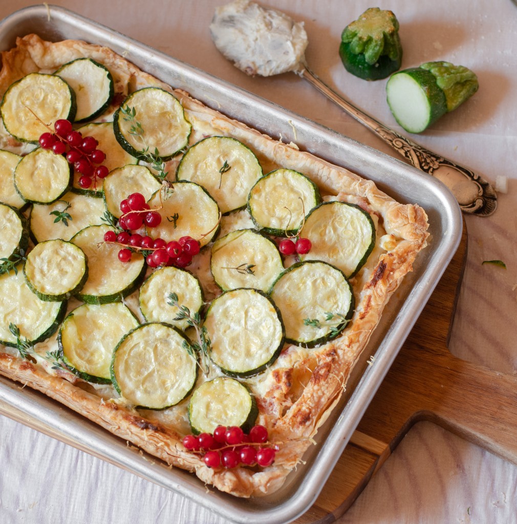 Puff pastry tart with bacon goat cheese topped with zucchini rounds.