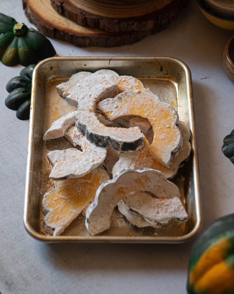 1 medium acorn squash, cut in half and seeded. Sliced into half moons a quarter inch thick. a quarter inch is roughly the size of finger nail. The space from the tip of your thumb to the knuckle is about an inch. A useful reference to have!