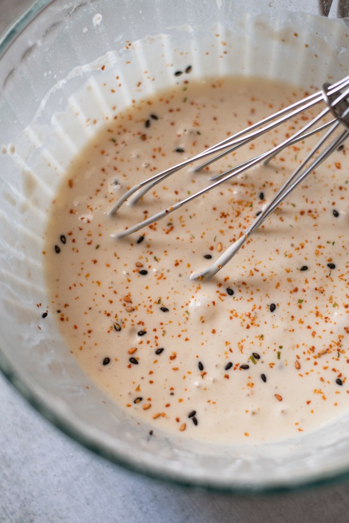 - Combine AP flour, salt, togarashi and kefir plus a few tablespoon of water and begin to stir. If the batter looks like it is clumping add in more water. It should be the consistency of pancake batter.