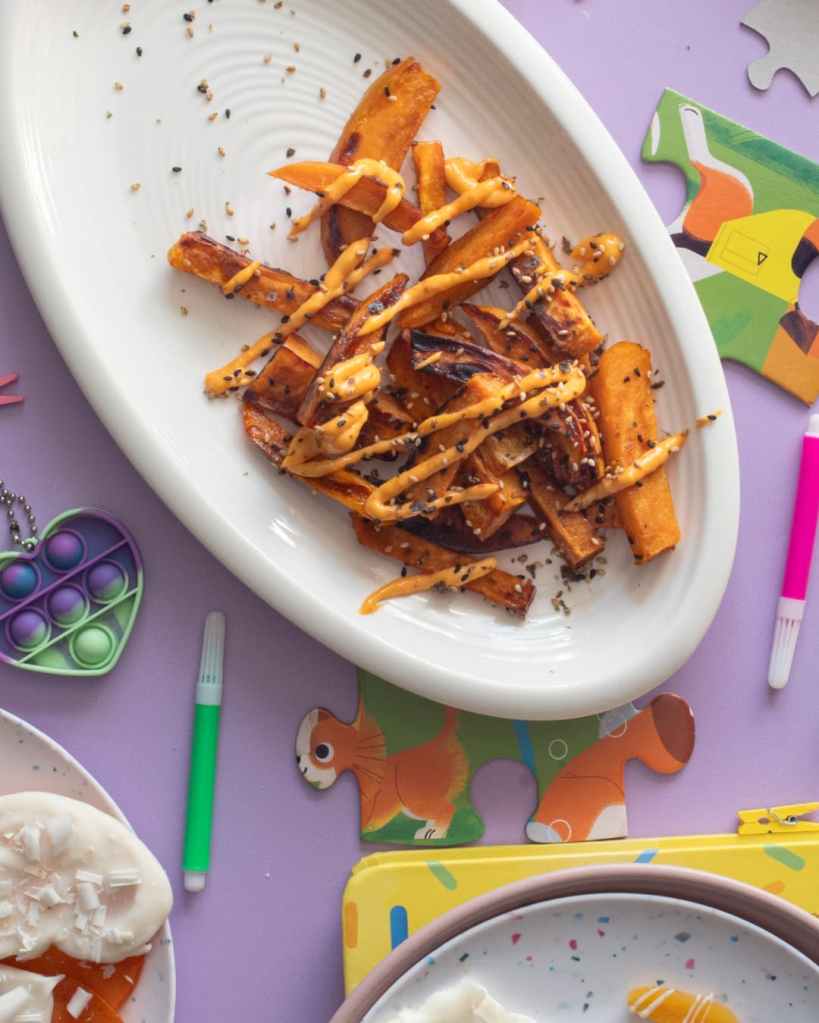 Snack pairing:Spicy Maple sweet potato fries with spicy mayo and furikake.