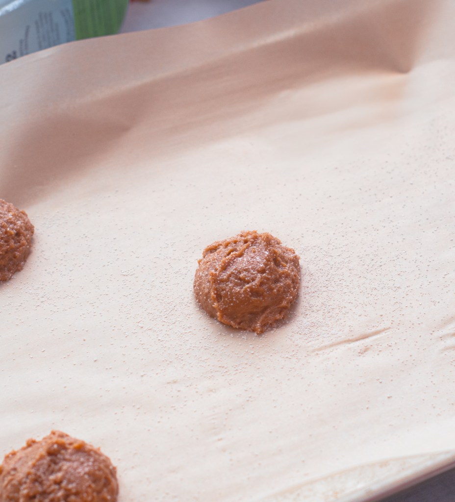 - Using a small ice cream scoop, scoop onto a parchment lined sheet tray 6 portions of cookies, spacing them about ½ inch apart.