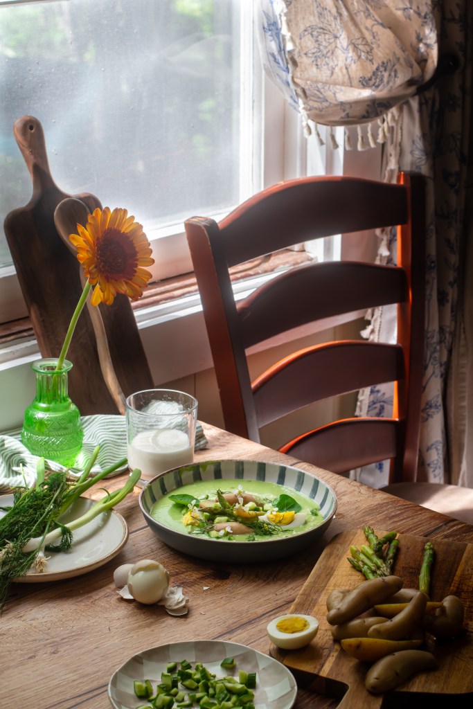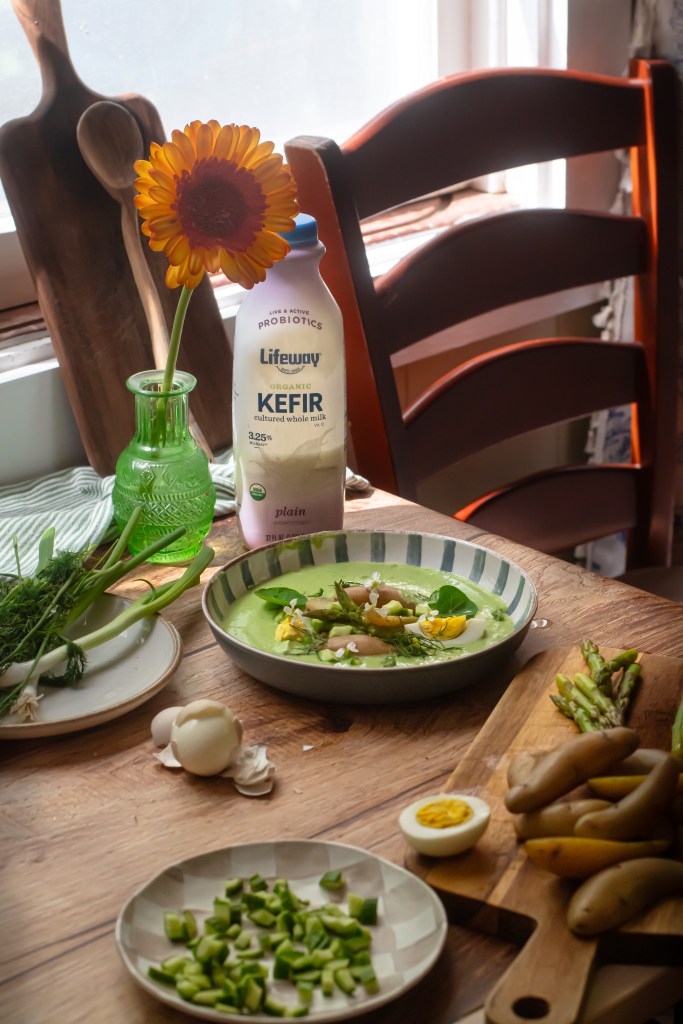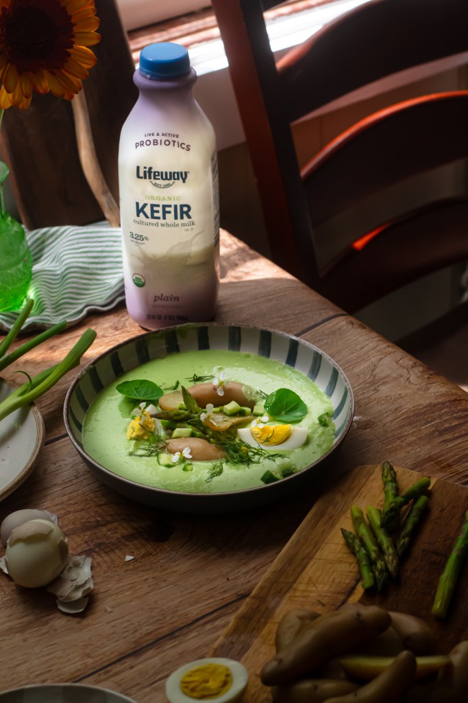 Taking inspiration from the many Eastern European cold soups, I partnered with Lifeway Kefir and created an ideal summer soup with seasonal asparagus, fingerling potatoes ( optionally small sweet new potatoes work just as well), cold crunchy cucumber and a mix of bright green herbs. The color packs a punch and so does the flavor.